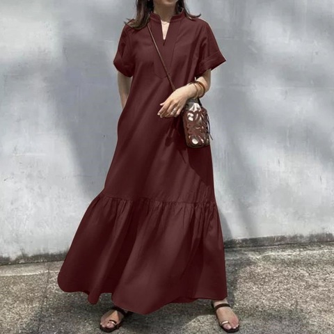 Женское летнее хлопковое льняное платье макси с V-образным вырезом и коротким рукавом, однотонное платье оверсайз с оборками большого размера, S-5XL